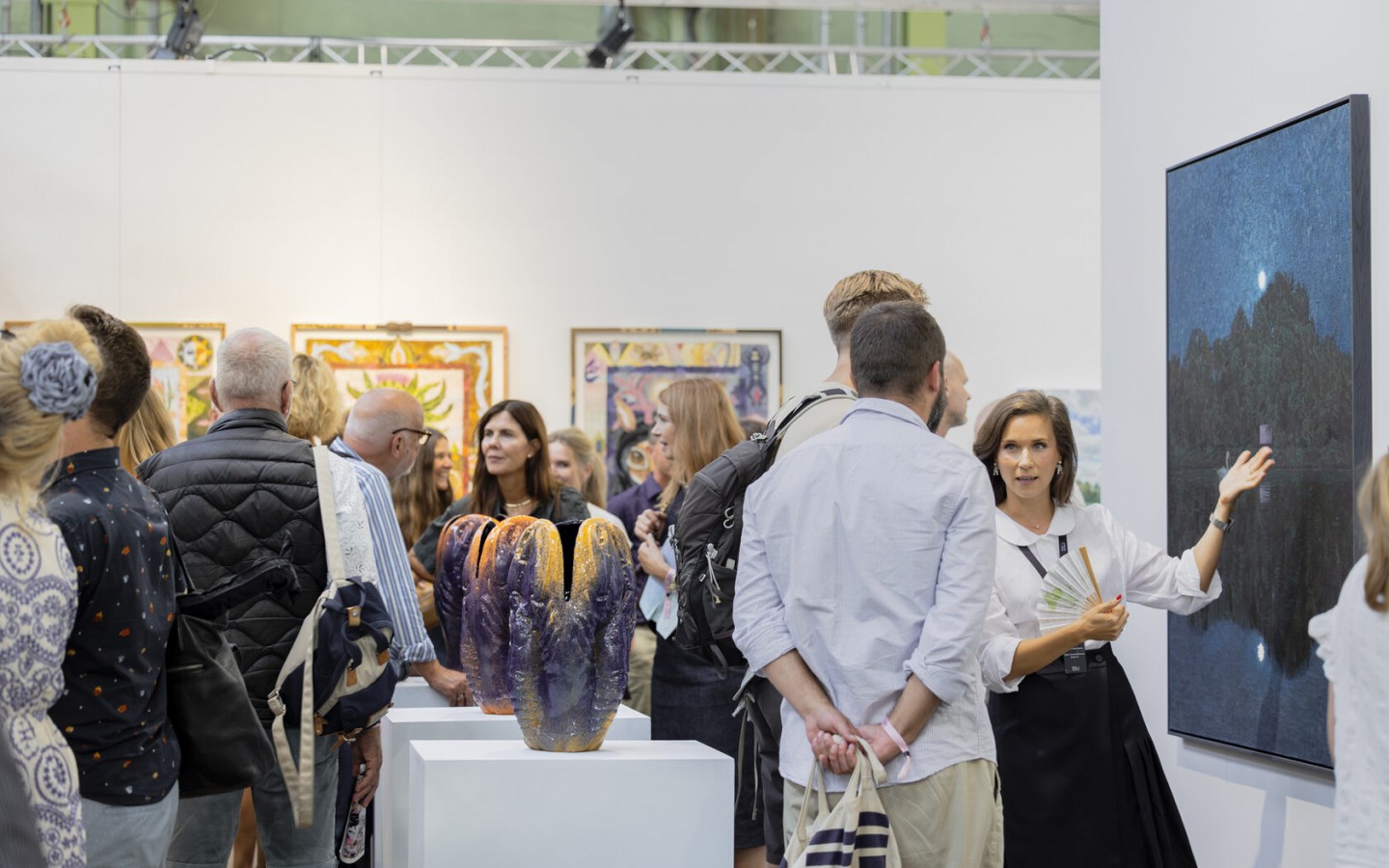 - 94 galleries from 19 countries present over 350 artists' works in diverse mediums .